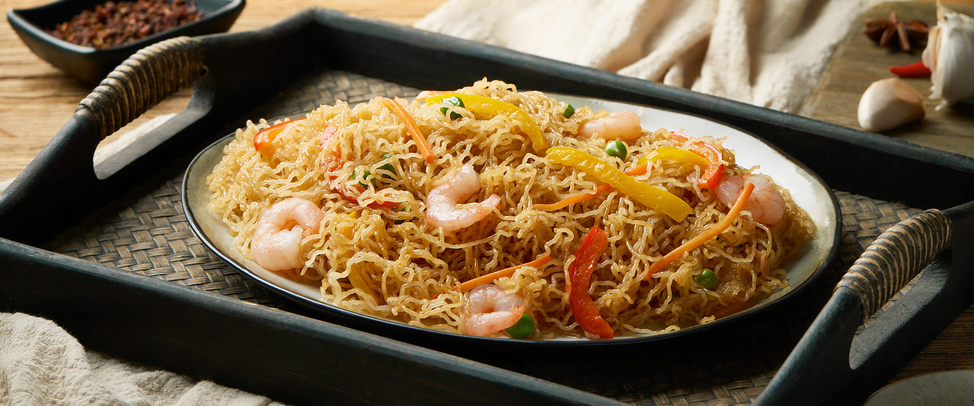 將米粉放入沸水中煮2 - 3分鐘后,撈起瀝干,根據個人口味添加配菜,一起放入托盤中,沸水蒸5~8分鐘即可食用。